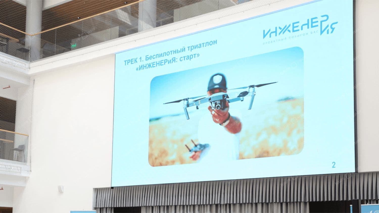 Размер экрана — 8000 x 4480 мм. Во время концертов, презентаций и театральных постановок на экран выводится фото- и видеоконтент, это позволяет сделать мероприятия более яркими и запоминающимися.