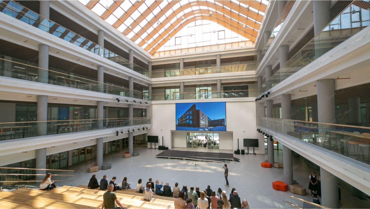 Компания Future Vision изготовила светодиодный экран для средней общеобразовательной школы № 220 имени К.Д. Ушинского. Теперь вместо традиционного, изолированного актового зала в школе есть атриум со светодиодным экраном на стене.