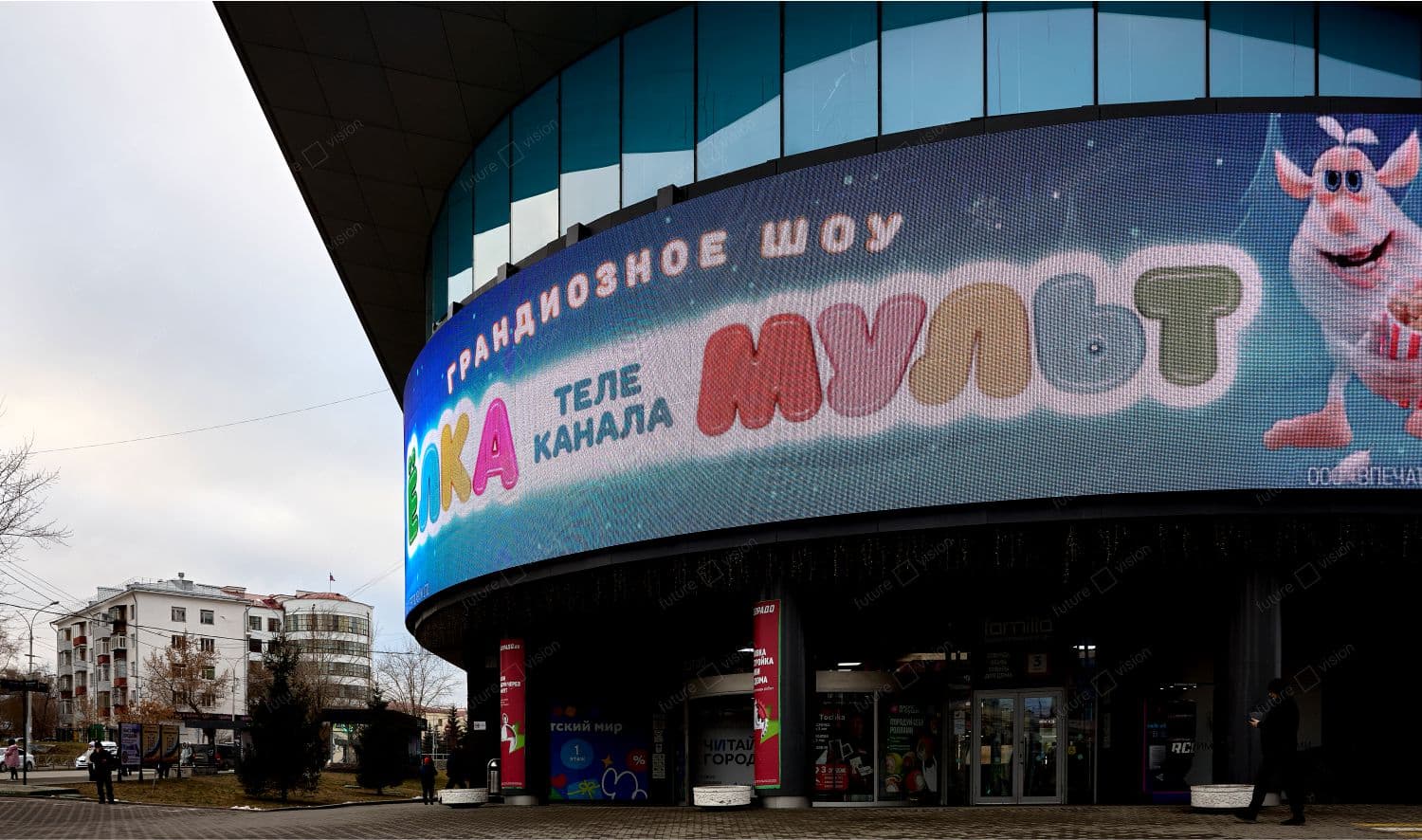 Специалисты завода Future Vision изготовили и установили светодиодный медиафасад для торгово-развлекательного центра «Алатырь», город Екатеринбург. Размер экрана составляет 42 500 х 5 000 мм, площадь — 212 м2, шаг пикселя — Р16-16.
